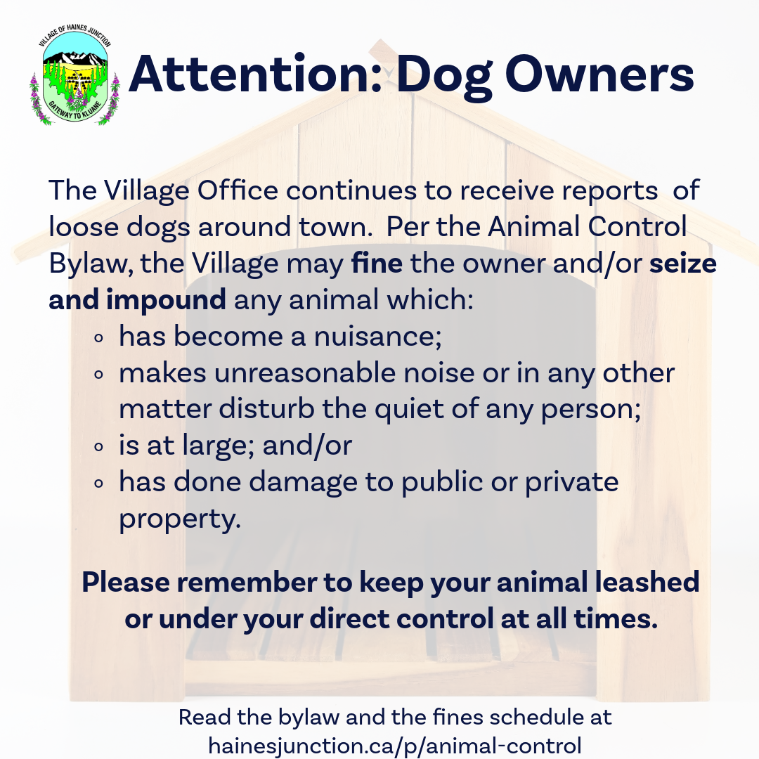 Animal control in the Village of Haines Junction is regulated through the Bylaw #83-95 Animal Control Bylaw.