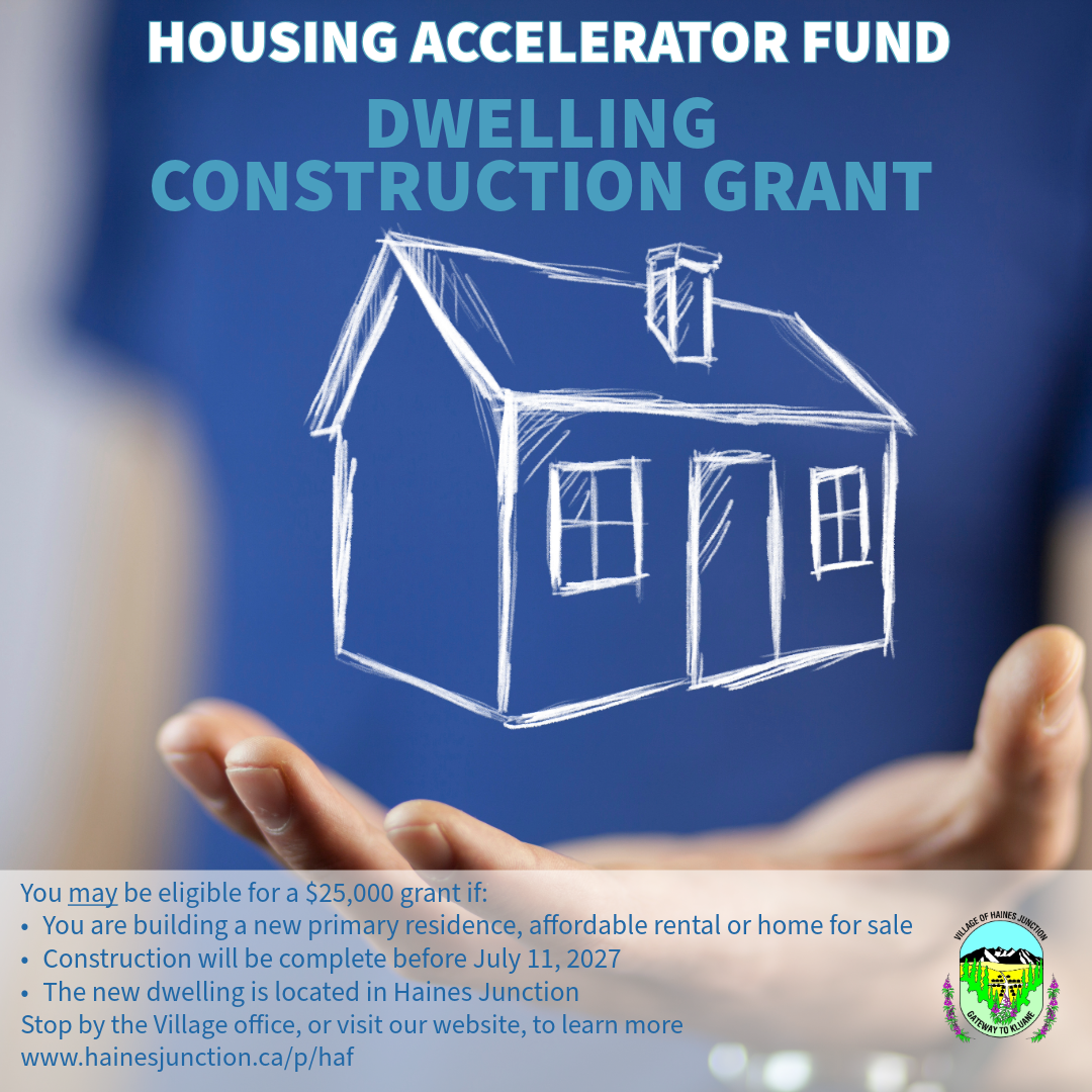 The Dwelling Construction Grant program aims to assist residents with construction of dwelling units within the Village of Haines Junction by providing financial assistance for eligible projects. The maximum eligible grant will be $25,000 per dwelling unit. Construction must be completed before July 11, 2027.